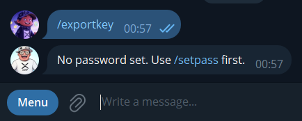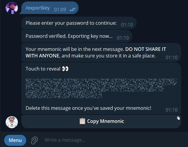 Use the /exportkey command to save your mnemonic.
